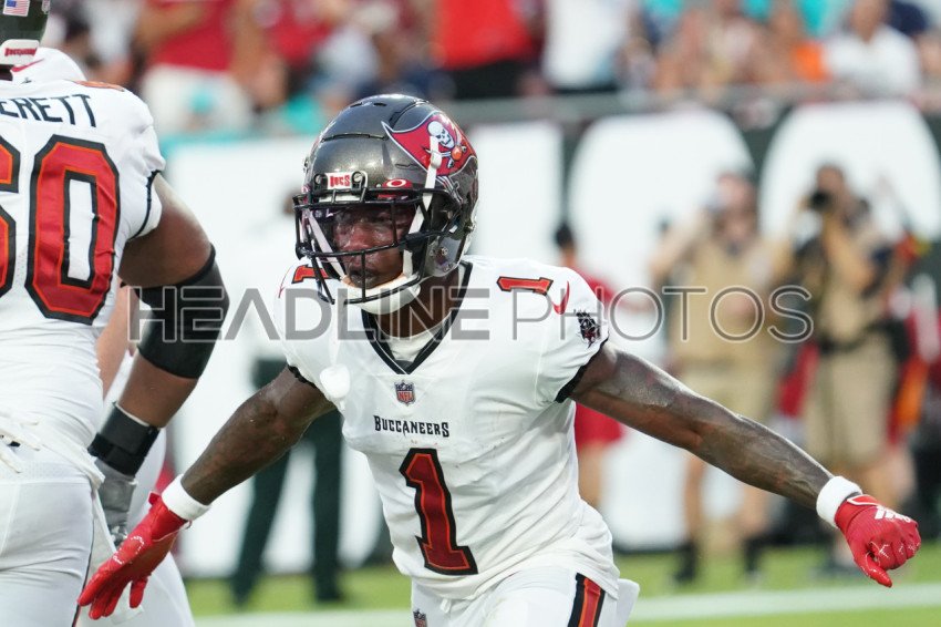 Tampa Bay, Florida, USA, August 13, 2022, Tampa Bay Buccaneers Wide Receiver Jaelon Darden #1 celebrate after touch down in the first quarter at Raymond James Stadium. (Photo Credit: Marty Jean-Louis)