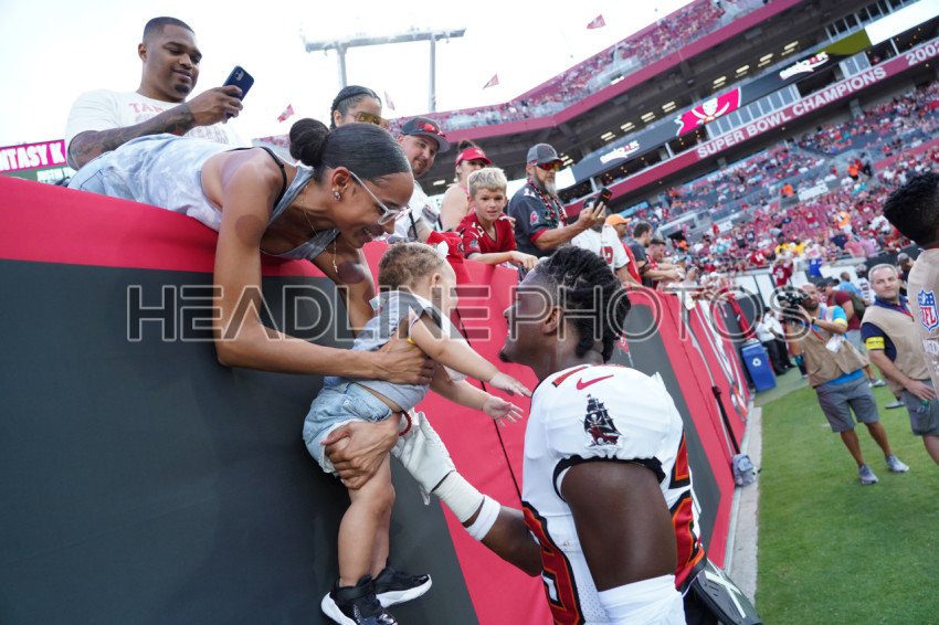 Tampa Bay, Florida, USA, August 13, 2022, Tampa Bay Buccaneers Running Back Rachaad White #29 playes with a baby at Raymond James Stadium. (Photo Credit: Marty Jean-Louis)
