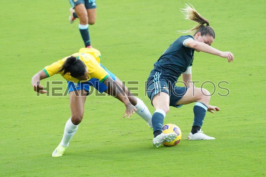 Orlando, Florida, USA, February 18, 2021, Brazilian and Argentinian players fight for the ball during the SheBelieves Cup at Exploria Stadium (Photo Credit: Marty Jean-Louis)
