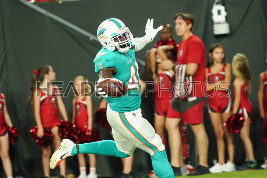 Tampa Bay, Florida, USA, August 13, 2022, Miami Dolphins Linebacker Sam Eguavoen #49 makes a touchdown in the second quarter at Raymond James Stadium. (Photo Credit: Marty Jean-Louis)