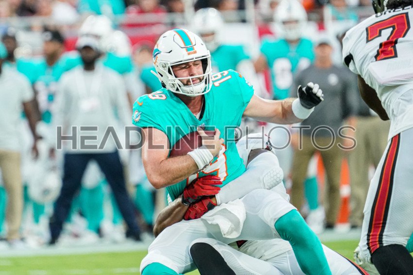 Tampa Bay, Florida, USA, August 13, 2022, Miami Dolphins Quarterback Skylar Thompson #19 gets sacked at Raymond James Stadium. (Photo Credit: Marty Jean-Louis)