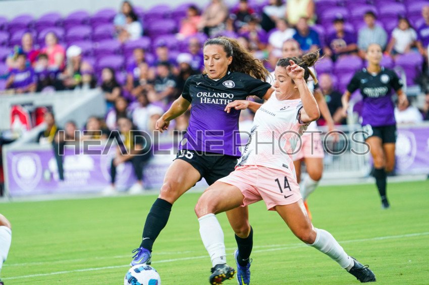 Orlando, Florida, USA, August 7, 2022, Angel City FC player Paige Nielsen #14 and Orlando Pride player Kerry Abello #25 fight for the ball at Exploria Stadium. (Photo Credit: Marty Jean-Louis)