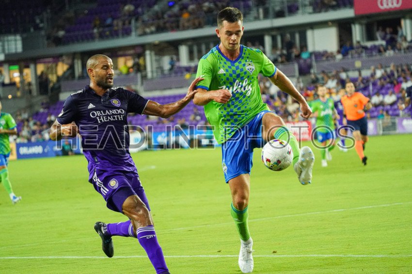 Orlando, Florida, USA, August 31, 2022,Seattle Sounders player Jackson Ragen #25 kicks the ball out of the danger zone at Exploria Stadium. (Photo Credit: Marty Jean-Louis)