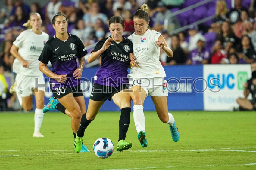 Orlando, Florida, USA, September 25, 2022, San Diego Waves and Orlando Pride players fight for the ball at Exploria Stadium. (Photo Credit: Marty Jean-Louis)