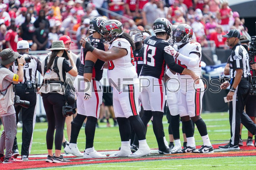 Tampa Bay, Florida, USA, October 9, 2022, Atlanta Falcons and Tampa Bay Buccaneers players share hugs at Raymond James Stadium. (Photo Credit: Marty Jean-Louis)