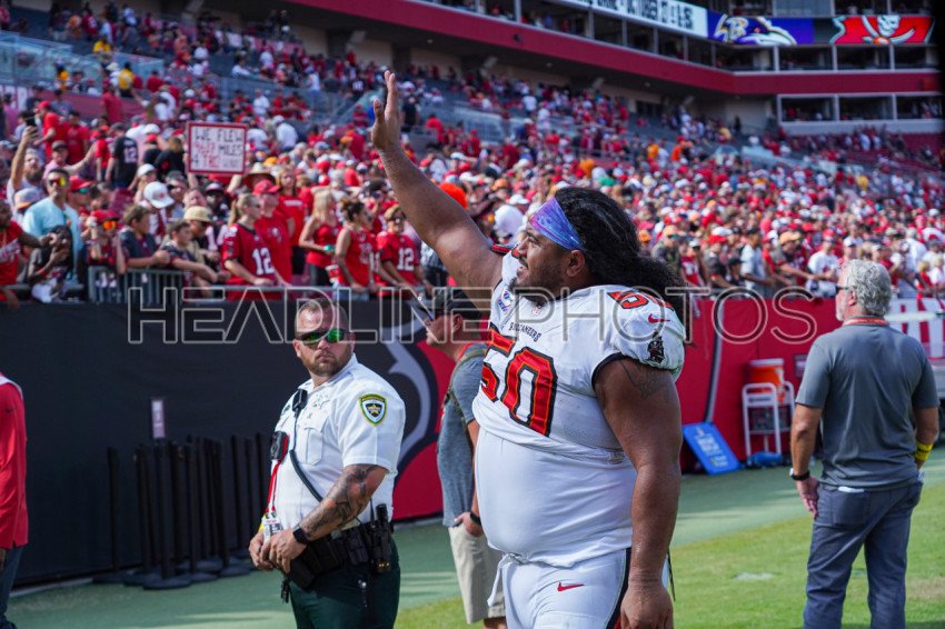 Tampa Bay, Florida, USA, October 9, 2022, Tampa Bay Buccaneers player Vita Vea #50 waving to fans after the game at Raymond James Stadium. (Photo Credit: Marty Jean-Louis)