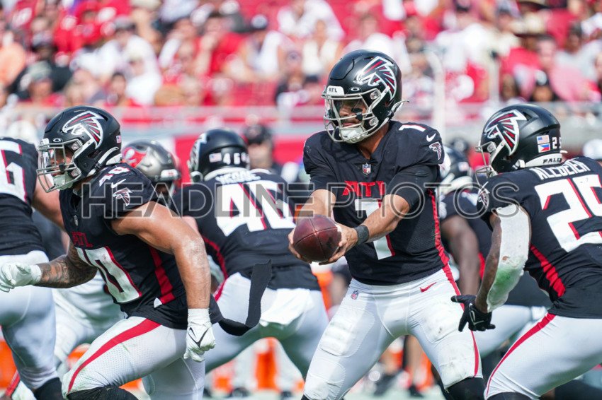 Tampa Bay, Florida, USA, October 9, 2022, Atlanta Falcons Quaterback Marcus Mariota #1 makes a pass during the 3rd quarter at Raymond James Stadium. (Photo Credit: Marty Jean-Louis)
