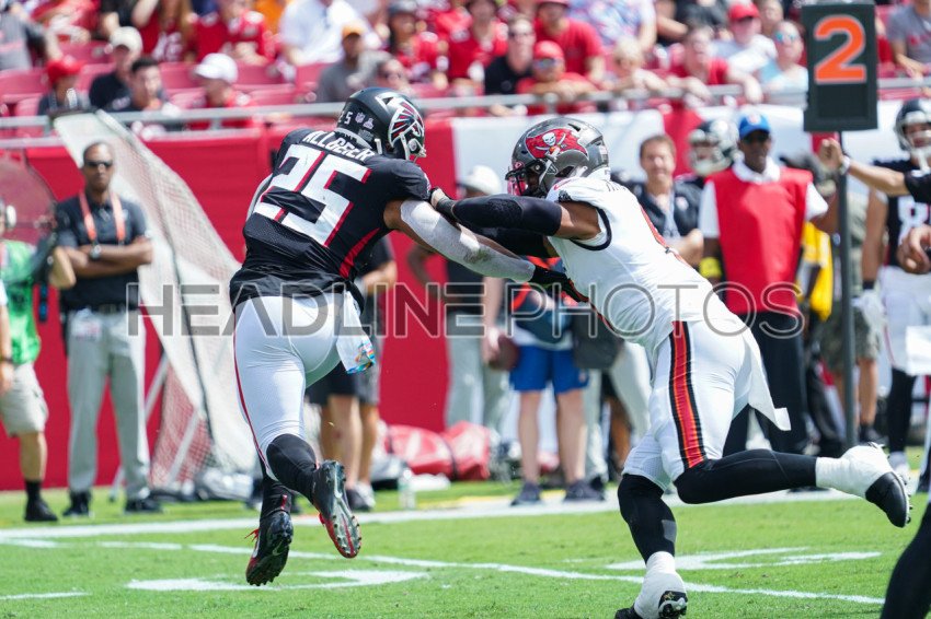 Tampa Bay, Florida, USA, October 9, 2022, Atlanta Falcons running back Tyler Allgeier #25 makes a run as he gets pressure by Tampa Bay Buccaneers player at Raymond James Stadium. (Photo Credit: Marty Jean-Louis)