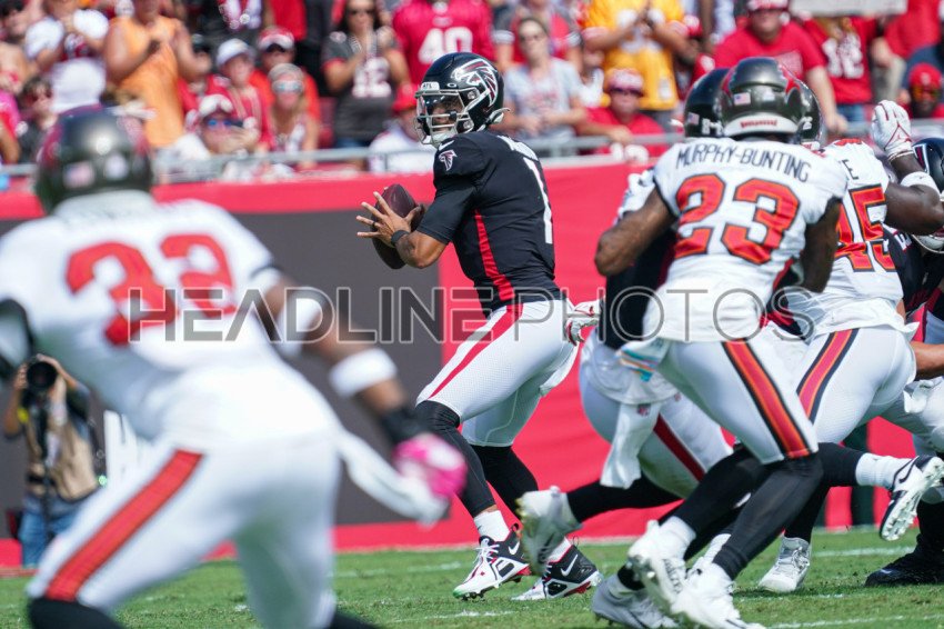 Tampa Bay, Florida, USA, October 9, 2022, Atlanta Falcons Quaterback Marcus Mariota #1 looks to make a pass as he gets pressure from Devin White #45 during the game at Raymond James Stadium. (Photo Credit: Marty Jean-Louis)