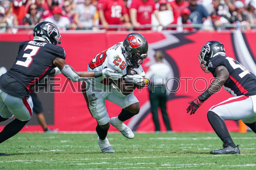 Tampa Bay, Florida, USA, October 9, 2022, Tampa Bay Buccaneers player Rachaad White\n #29 makes a run as he receives pressure from Atlanta at Raymond James Stadium. (Photo Credit: Marty Jean-Louis)