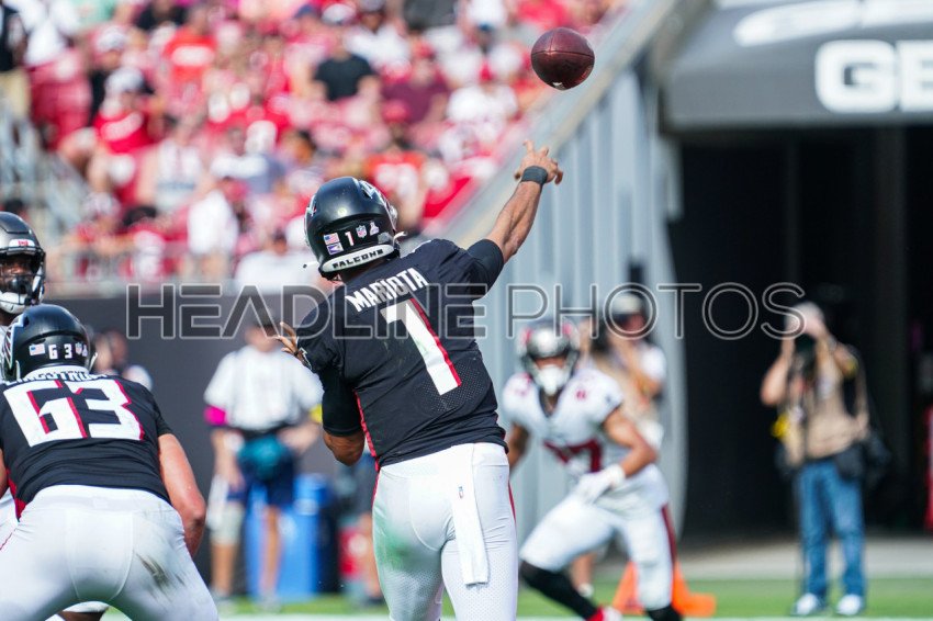 Tampa Bay, Florida, USA, October 9, 2022, Atlanta Falcons Quaterback Marcus Mariota #1 makes a pass during the 3rd quarter at Raymond James Stadium. (Photo Credit: Marty Jean-Louis)
