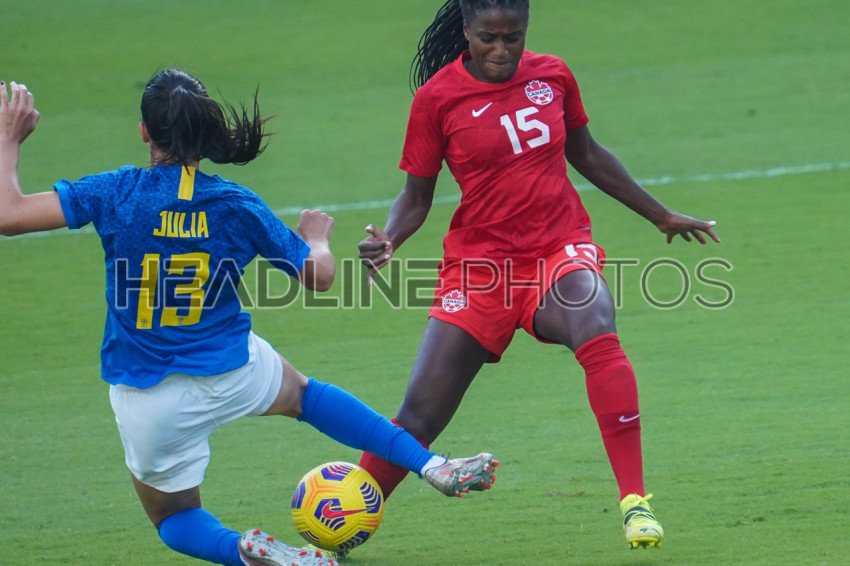 Orlando, Florida, USA, February 24, 2021, Canada's Nichelle Prince #15 and Brazil's Julia #13 fight for the ball during the SheBelieves Cup at Exploria Stadium (Photo Credit: Marty Jean-Louis)