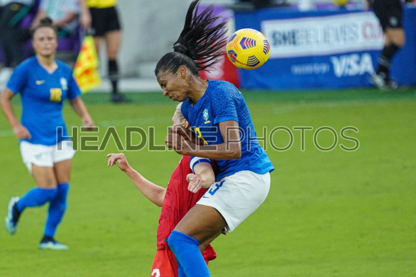 Orlando, Florida, USA, February 24, 2021, Brazil defender Bruna #3 makes a header during the SheBelieves Cup at Exploria Stadium (Photo Credit: Marty Jean-Louis)