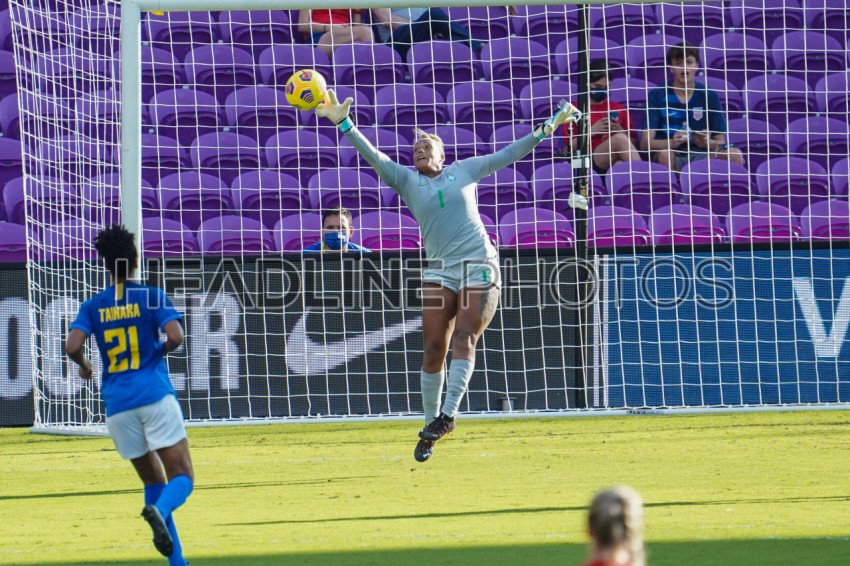 Orlando, Florida, USA, February 24, 2021, Brazil Goalkeeper Barbara #1 jumps after the ball during the SheBelieves Cup at Exploria Stadium (Photo Credit: Marty Jean-Louis)