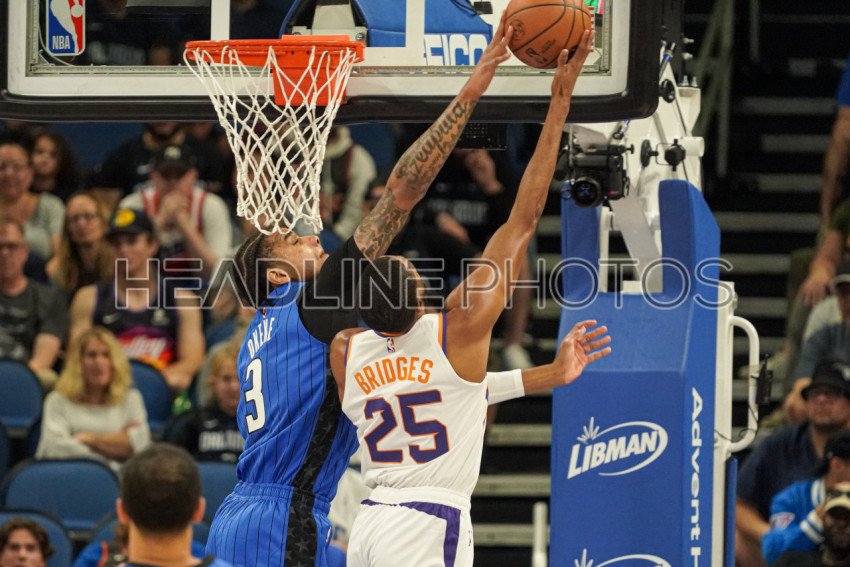 Orlando, Florida, USA, November 7, 2022, Phoenix Suns Small Forward Mikal Bridges #25 attempt to make a basket but is blocked by Chuma Okeke #3 in the first half at the Amway Center. (Photo Credit: Marty Jean-Louis)