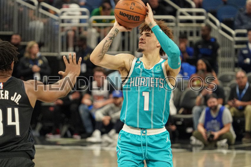 Orlando, Florida, USA, November 14, 2022, Charlotte Hornests Guard LaMelo Ball #1 shoots a three in the first half at the Amway Center. (Photo Credit: Marty Jean-Louis)