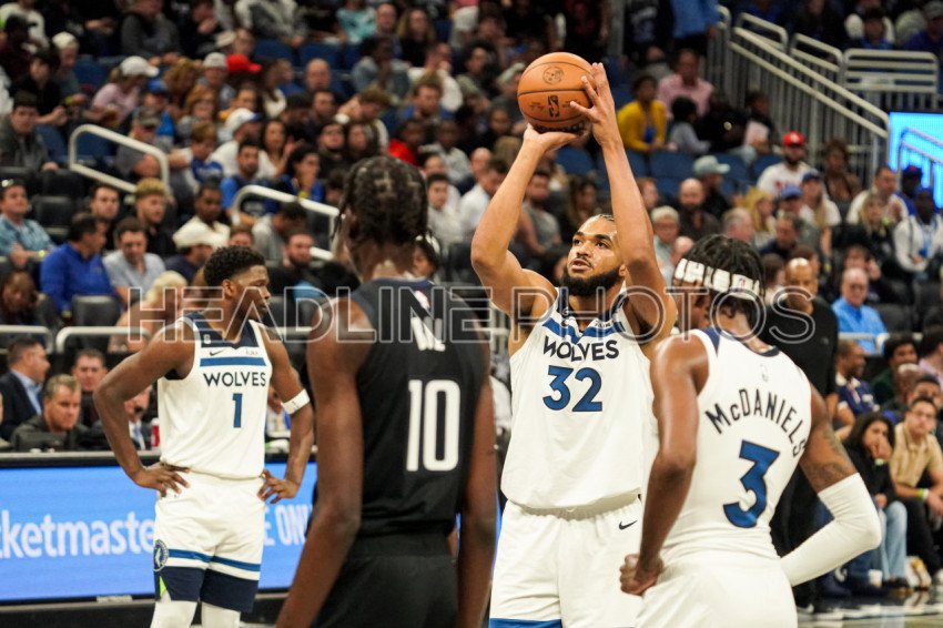 Orlando, Florida, USA, November 16, 2022, Minnesota Timberwolves Center Karl-Anthony Towns #32 shoots a free throw in the first half at the Amway Center. (Photo Credit: Marty Jean-Louis)