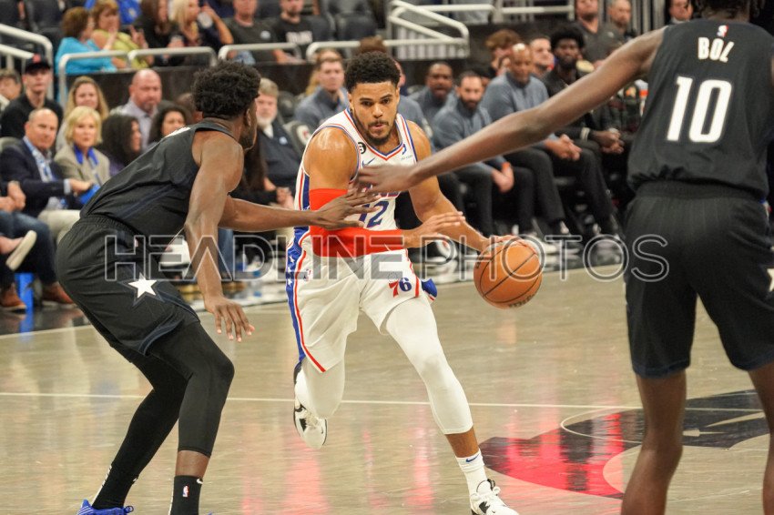Orlando, Florida, USA, November 25, 2022, Philadelphia 76ers forward Tobias Harris #12 attempt to run pass Mo Bamba #11 and Bol Bol #10 during the first half at the Amway Center. (Photo Credit: Marty Jean-Louis)