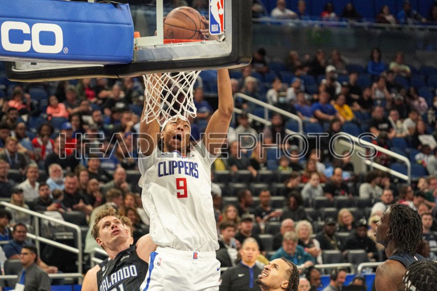 Orlando, Florida, USA, December 7, 2022, Los Angeles Clippers center Moses Brown #9 makes a dunk during the second half at the Amway Center. (Photo Credit: Marty Jean-Louis)