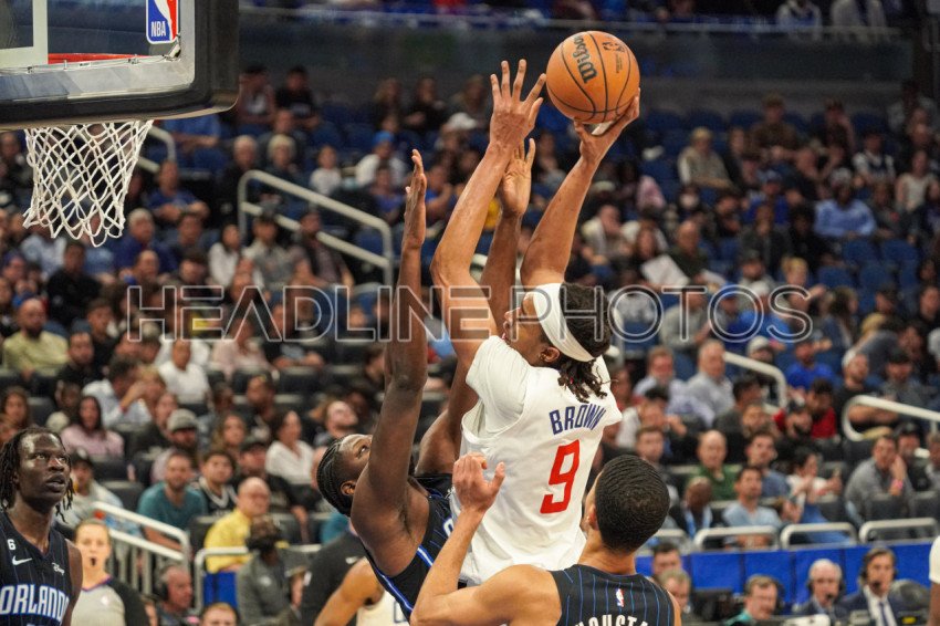 Orlando, Florida, USA, December 7, 2022, Los Angeles Clippers center Moses Brown #9 attempt to make a basket at the Amway Center. (Photo Credit: Marty Jean-Louis)
