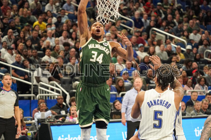 Orlando, Florida, USA, December 5, 2022, Milwaukee Bucks forward Giannis Antetokounmpo #34 makes a dunk during the second half at the Amway Center. (Photo Credit: Marty Jean-Louis)