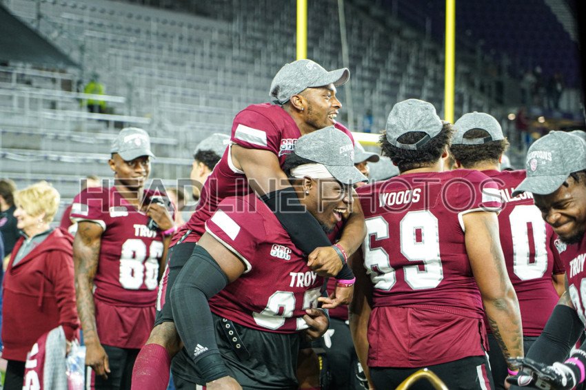 Orlando, Florida, USA, December 16, 2022, Troy Trojans players celebrate after winning the Duluth Cure Bowl at Exploria Stadium. (Photo Credit: Marty Jean-Louis)