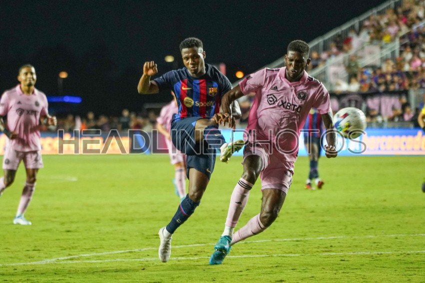 Fort Lauderdale, Florida, USA, July 19, 2022, FC Barcelona forward Ansu Fati #10 takes a shot and scores against Inter Miami at DRV PNK Stadium in a Friendly Match. (Photo Credit: Marty Jean-Louis)