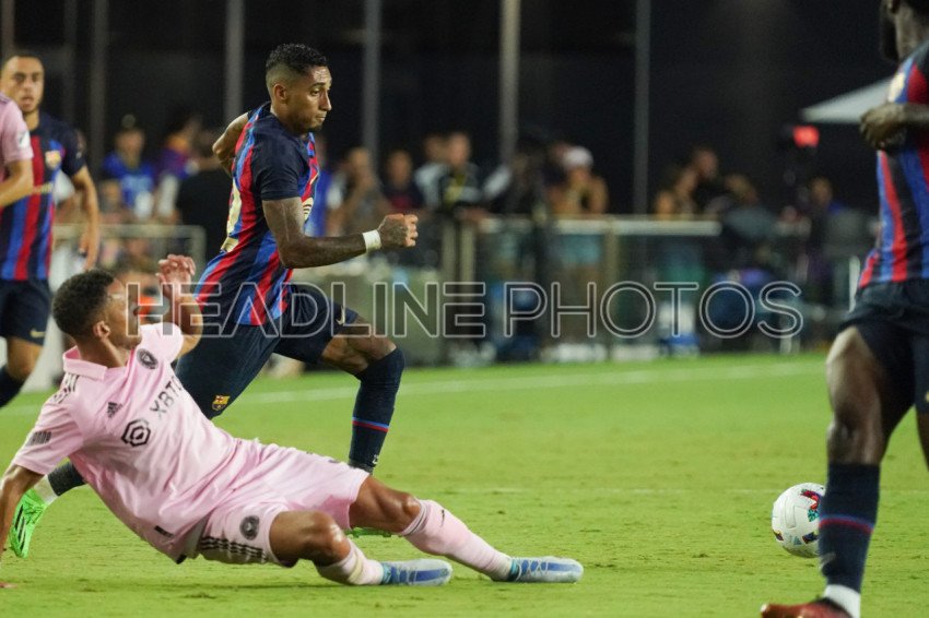 Fort Lauderdale, Florida, USA, July 19, 2022, FC Barcelona forward Raphinha #22 makes a run as he gets tackled by Inter Miami player at DRV PNK Stadium in a Friendly Match. (Photo Credit: Marty Jean-Louis)