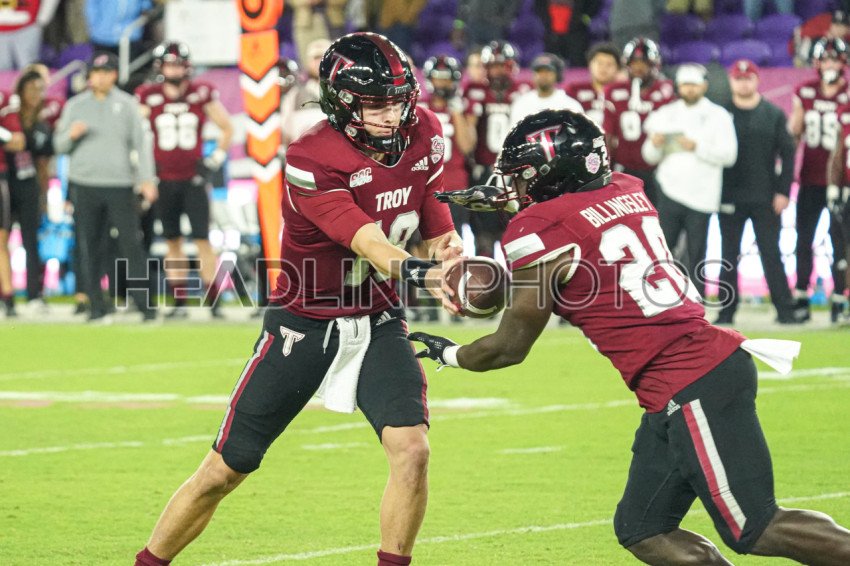 Orlando, Florida, USA, December 16, 2022, Troy Trojans Quarterback Gunnar Watson #18 makes a pass to DK Billingsley #20 in the second half at Exploria Stadium. (Photo Credit: Marty Jean-Louis)