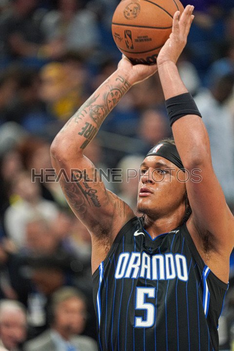 Orlando, Florida, USA, November 4, 2023, Orlando Magic player Paolo Banchero #5 shoots a free throw at the Amway Center. (Photo Credit: Marty Jean-Louis)