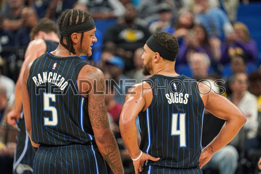 Orlando, Florida, USA, November 4, 2023, Orlando Magic players Paolo Banchero #5 and Jalen Suggs #4 having a conversation during the first half at the Amway Center. (Photo Credit: Marty Jean-Louis)