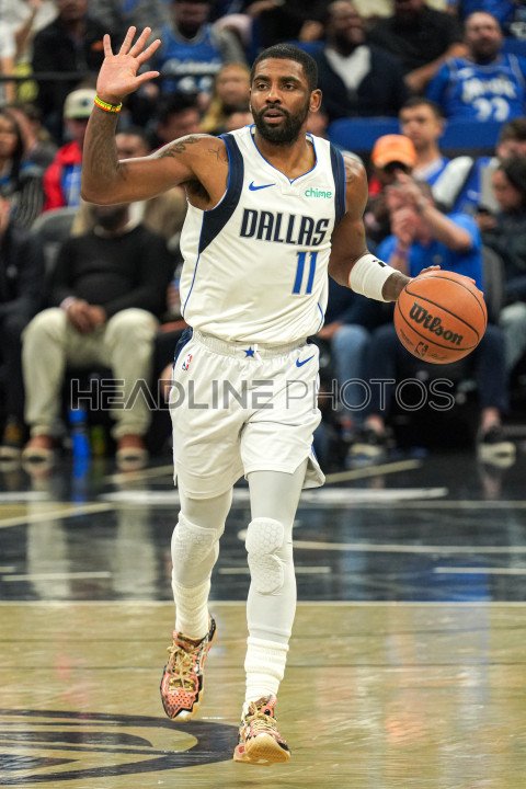 Orlando, Florida, USA, November 6, 2023, Dallas Mavericks guard Kyrie Irving #11 with 5 fingers signs his team mates during the first half at the Amway Center. (Photo Credit: Marty Jean-Louis)