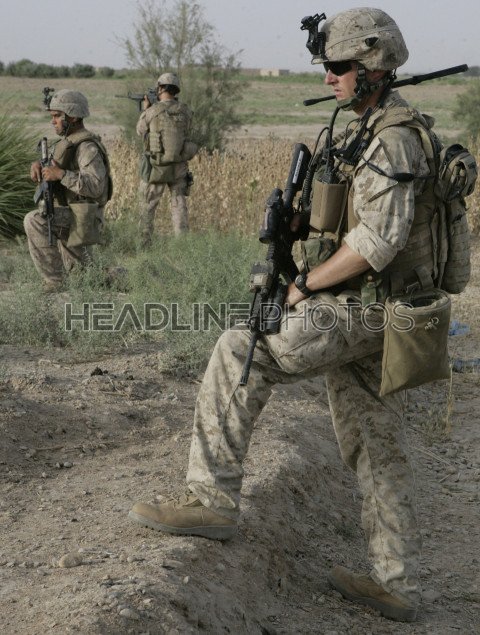 080515-M-9966C-342 U.S. Marines provide security near a road in the Helmand Province, Afghanistan, on May 15, 2008. The Marines are assigned to Bravo Company, 1st Battalion, 6th Marine Regiment, 24th Marine Expeditionary Unit, International Security Assistance Force. DoD photo by Cpl. Andrew J. Carlson, U.S. Marine Corps. (Released)