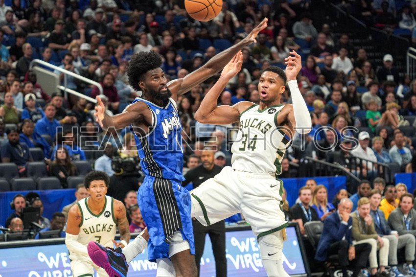 Orlando, Florida, USA, November 11, 2023, Milwaukee Bucks forward Giannis Antetokounmpo #34 attempt to make a pass but is blocked by Jonathan Isaac #1 during the second half at the Amway Center. (Photo Credit: Marty Jean-Louis)