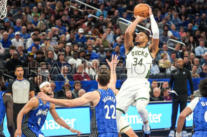 Orlando, Florida, USA, November 11, 2023, Milwaukee Bucks forward Giannis Antetokounmpo #34 shoots a three during the second half at the Amway Center. (Photo Credit: Marty Jean-Louis)