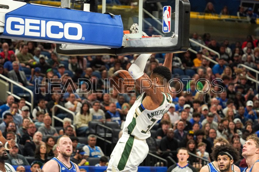 Orlando, Florida, USA, November 11, 2023, Milwaukee Bucks forward Giannis Antetokounmpo #34 makes a dunk during the second half at the Amway Center. (Photo Credit: Marty Jean-Louis)