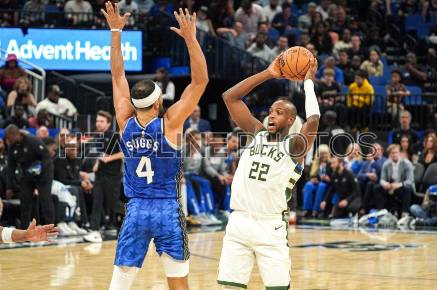 Orlando, Florida, USA, November 11, 2023, Milwaukee Bucks forward Khris Middleton #22 attempt to make a pass as Jalen Suggs #4 attempt to block during the second half at the Amway Center. (Photo Credit: Marty Jean-Louis)
