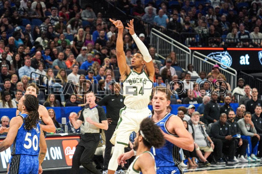 Orlando, Florida, USA, November 11, 2023, Milwaukee Bucks forward Giannis Antetokounmpo #34 shoots a three during the second half at the Amway Center. (Photo Credit: Marty Jean-Louis)