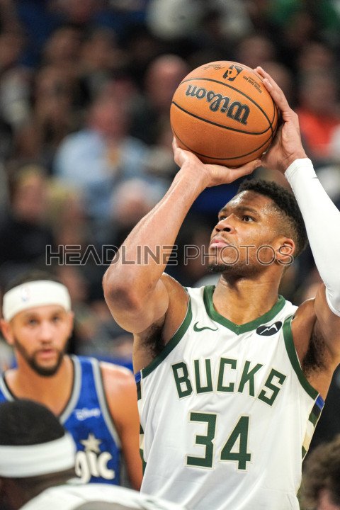 Orlando, Florida, USA, November 11, 2023, Milwaukee Bucks forward Giannis Antetokounmpo #34 shoots a free throw during the second half at the Amway Center. (Photo Credit: Marty Jean-Louis)