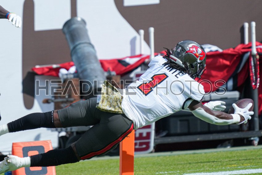 Tampa Bay, Florida, USA, November 12, 2023, Tampa Bay Buccaneers player Rachaad White #1 makes a touchdown at Raymond James Stadium. (Photo Credit: Marty Jean-Louis)