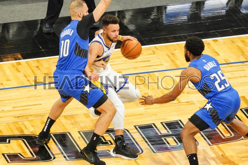 Orlando, Florida, USA, February 19, 2021, Golden State Warriors' Steph Curry #30 is boxed in by the Orlando Magicplayers Evan Fournier #10 and Chasson Randle #25 at the Amway Center (Photo Credit: Marty Jean-Louis)