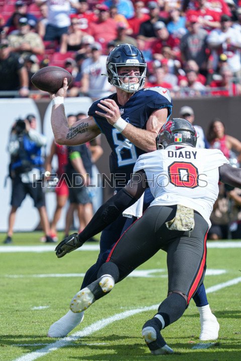 Tampa Bay, Florida, USA, November 12, 2023, Tennessee Titans quarterback Will Levis #8 readies to make a pass during the first half at Raymond James Stadium. (Photo Credit: Marty Jean-Louis)