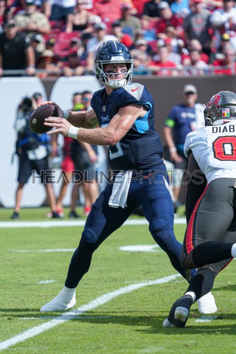 Tampa Bay, Florida, USA, November 12, 2023, Tennessee Titans quarterback Will Levis #8 readies to make a pass during the first half at Raymond James Stadium. (Photo Credit: Marty Jean-Louis)