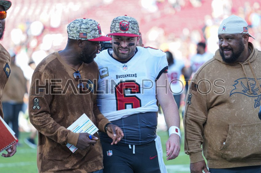 Tampa Bay, Florida, USA, November 12, 2023, Tampa Bay Buccaneers quarterback Baker Mayfield #6 smiles after a win against the Tennessee Titans at Raymond James Stadium. (Photo Credit: Marty Jean-Louis)