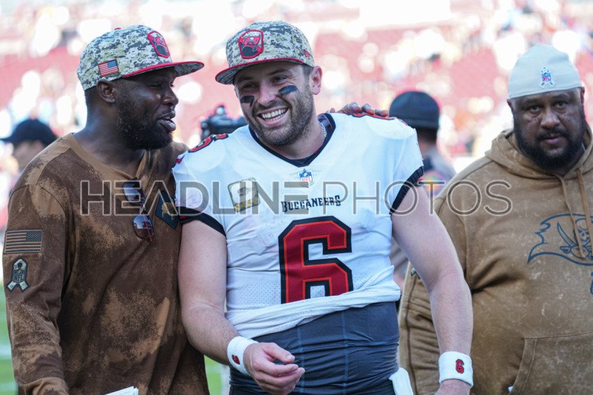 Tampa Bay, Florida, USA, November 12, 2023, Tampa Bay Buccaneers quarterback Baker Mayfield #6 smiles after a win against the Tennessee Titans at Raymond James Stadium. (Photo Credit: Marty Jean-Louis)