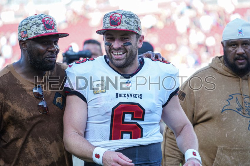 Tampa Bay, Florida, USA, November 12, 2023, Tampa Bay Buccaneers quarterback Baker Mayfield #6 smiles after a win against the Tennessee Titans at Raymond James Stadium. (Photo Credit: Marty Jean-Louis)