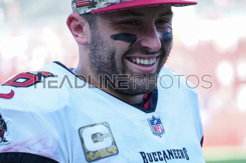 Tampa Bay, Florida, USA, November 12, 2023, Tampa Bay Buccaneers quarterback Baker Mayfield #6 smiles after a win against the Tennessee Titans at Raymond James Stadium. (Photo Credit: Marty Jean-Louis)