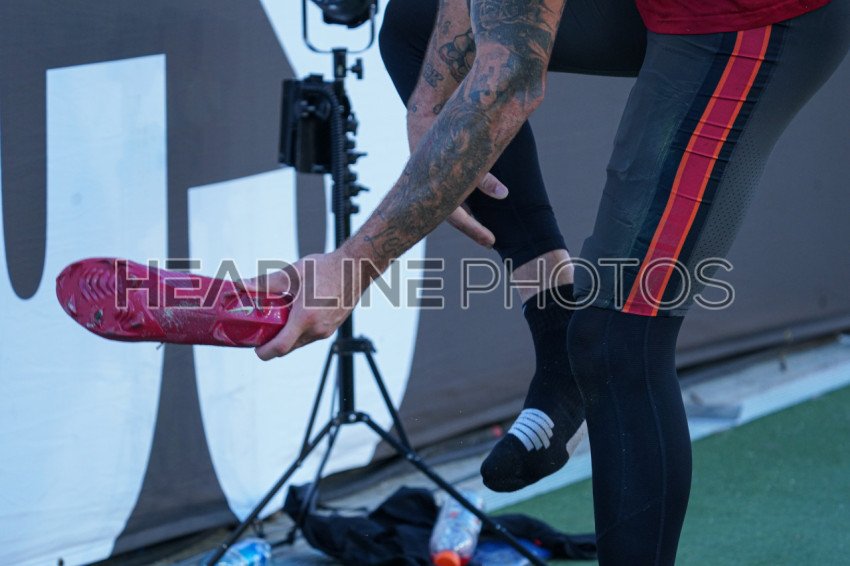 Tampa Bay, Florida, USA, November 12, 2023, Tampa Bay Buccaneers player Mike Evans remove his shoes to hand to a fan after a win against the Tennesee Titans at Raymond James Stadium. (Photo Credit: Marty Jean-Louis)