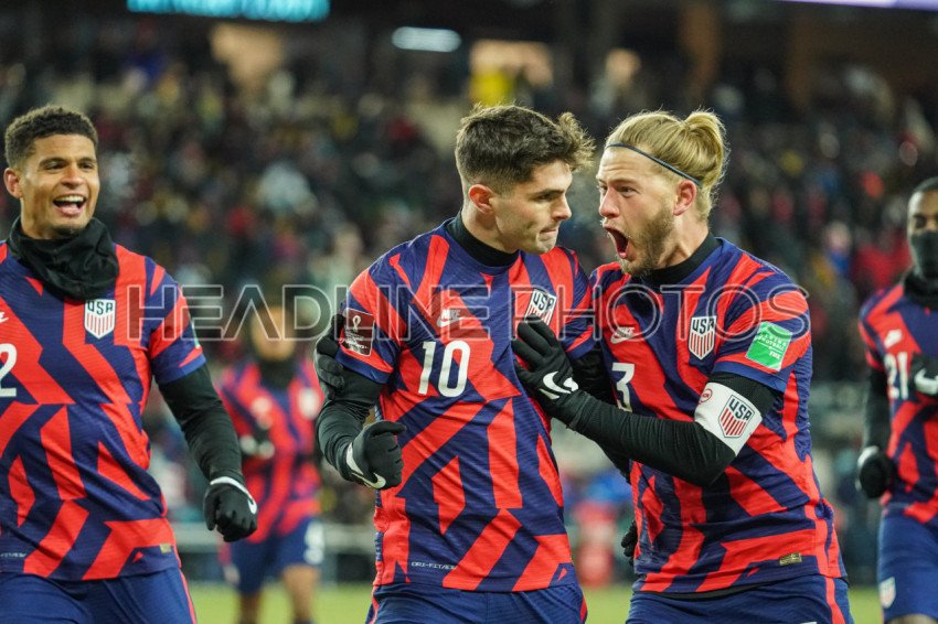 St. Paul, Minnesota, USA, February 2, 2022, USA Forward Christian Pulisic #10 and teammates celebrate after goal during the 2022 World Cup Qualifier at Allianz Field. (Photo Credit: Marty Jean-Louis)