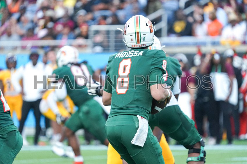 Orlando, Florida, USA, November 18, 2023, Florida A&M quarterback Jeremy Moussa #8 look to make a pass during the Florida Classics at Camping World Stadium. (Photo Credit: Marty Jean-Louis)